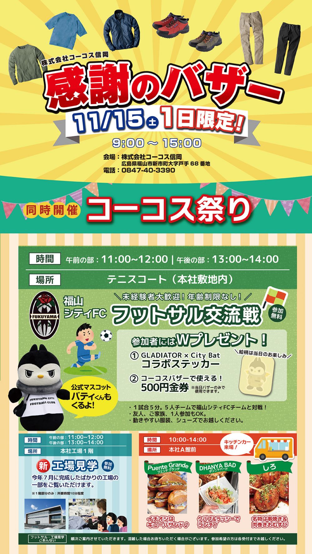 11月15日(土)に、弊社本社(広島県福山市)にて、恒例の「感謝のバザー」を開催致します。