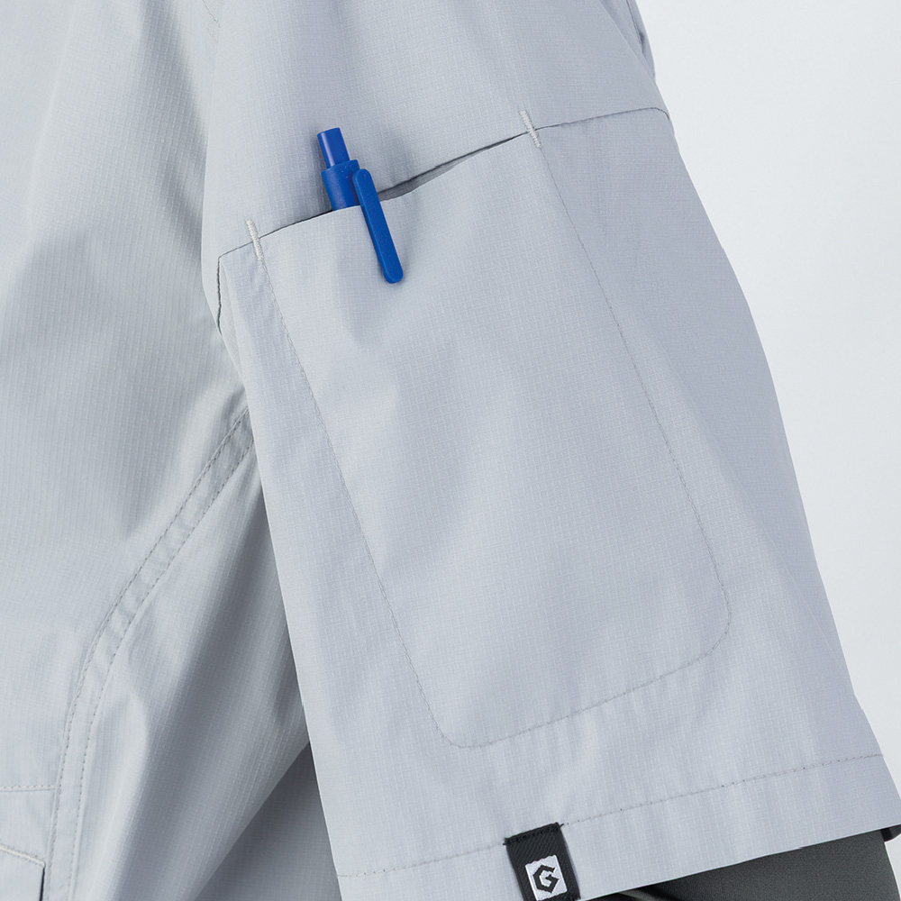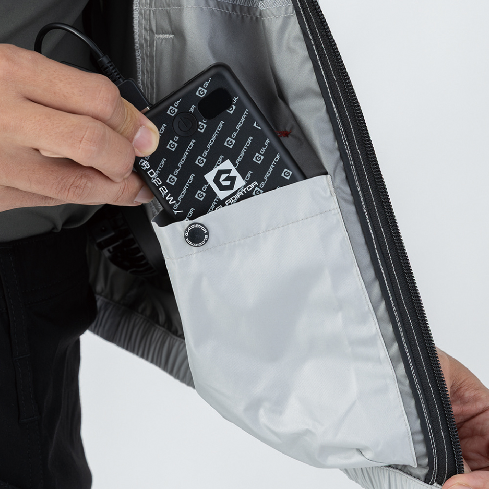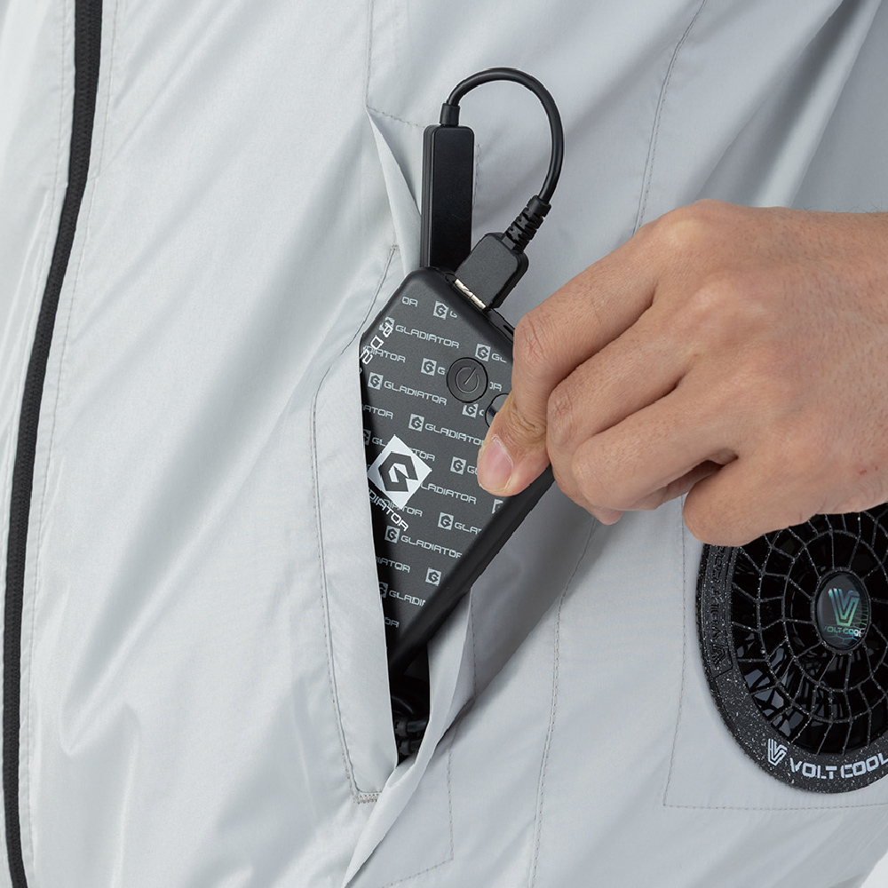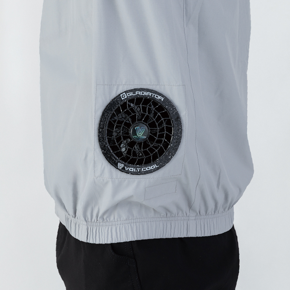 裏アルミコーティングの「日傘遮熱®」でマイナス11度を実現。刈払機肩掛けベルトの取り出し口を装備し、シート着座時でもファンが邪魔にならないサイドファン仕様。