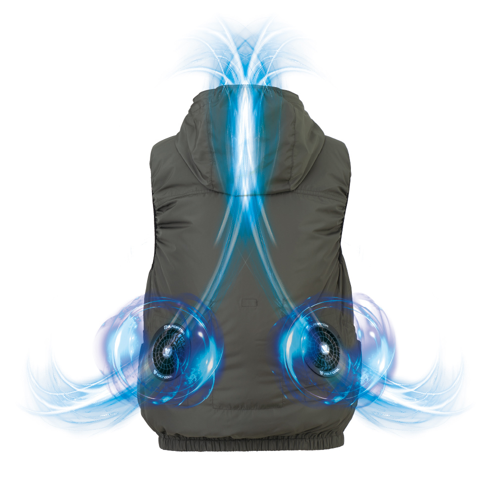 一番効率的に身体を冷やす衿元にペルチェデバイスを取り付け可能。1台のモバイルバッテリーでファンとペルチェデバイスに同時給電でき、ボルトクール®シリーズの特許技術と使いやすさを継承した空調ウェア。