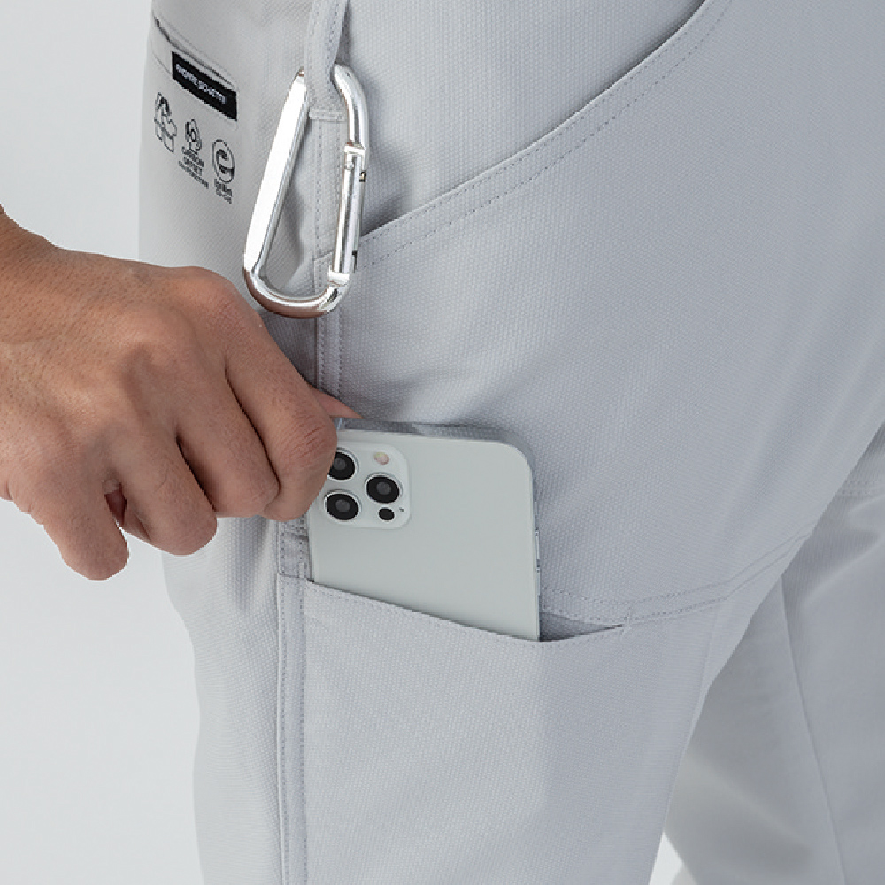 企業のSDGsや環境活動への貢献につながる再生PET素材使用の「ボトルテック®」と、軽量でバネのように伸びる「ライトフィックス®」ストレッチ素材を採用し、ノンストレスな着用感を実現。両脇の保冷剤ポケットで暑熱対策にも対応します。
